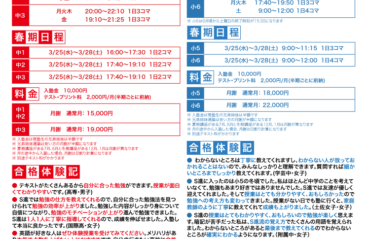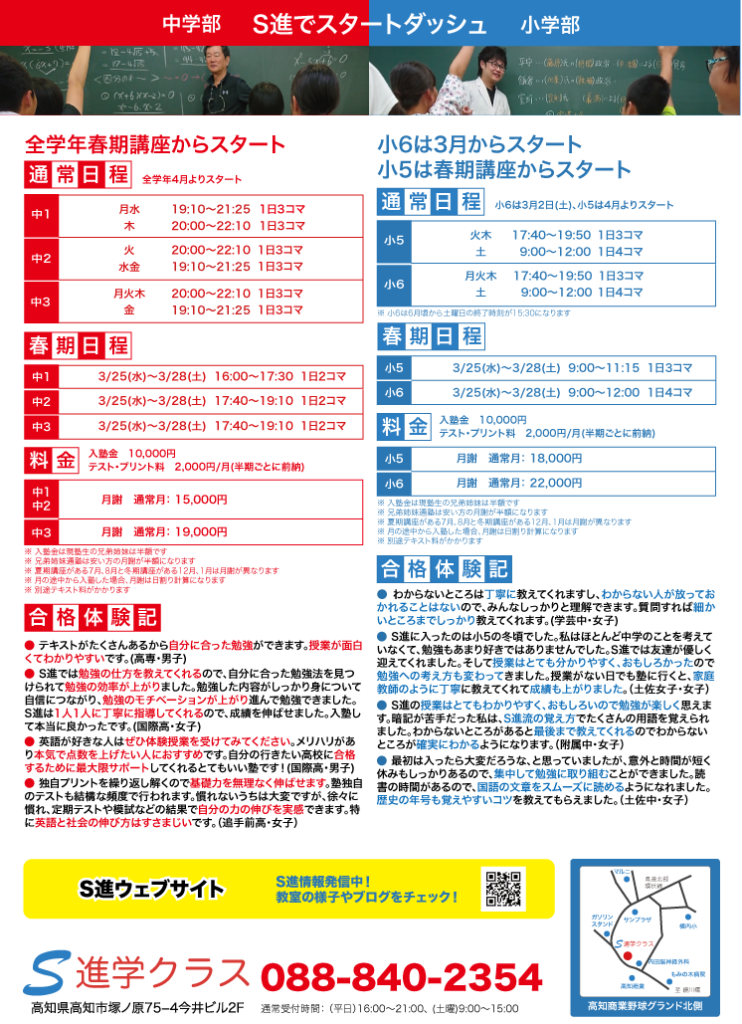 中学受験も高校受験も内申点対策もS進の春期講座でスタートダッシュしましょう。